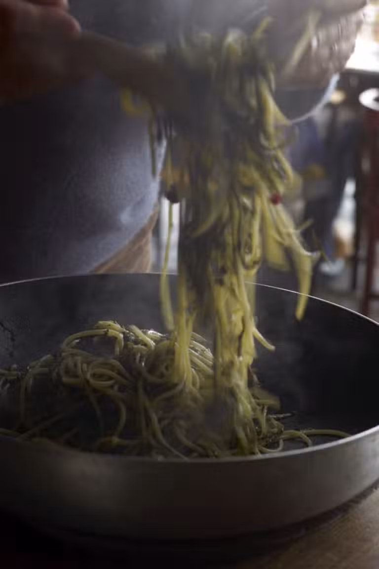 Drain it and add it to the leaves, tossing all the ingredients over a high heat for a couple of minutes.